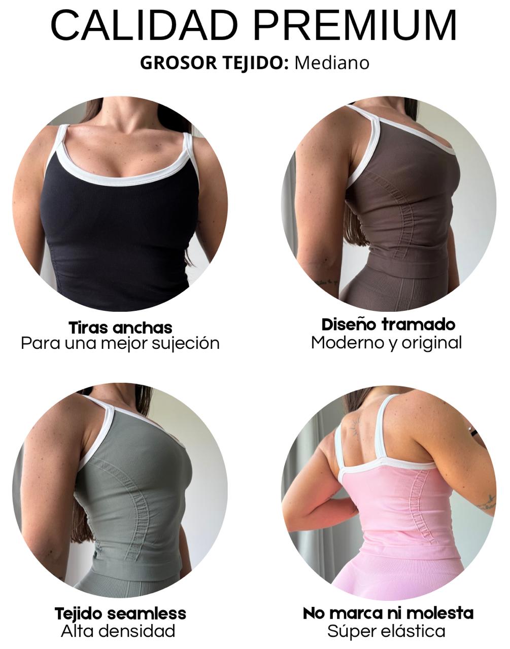No tiene costuras, esta fabricada con tejido seamless premium: no marca y ni molesta.